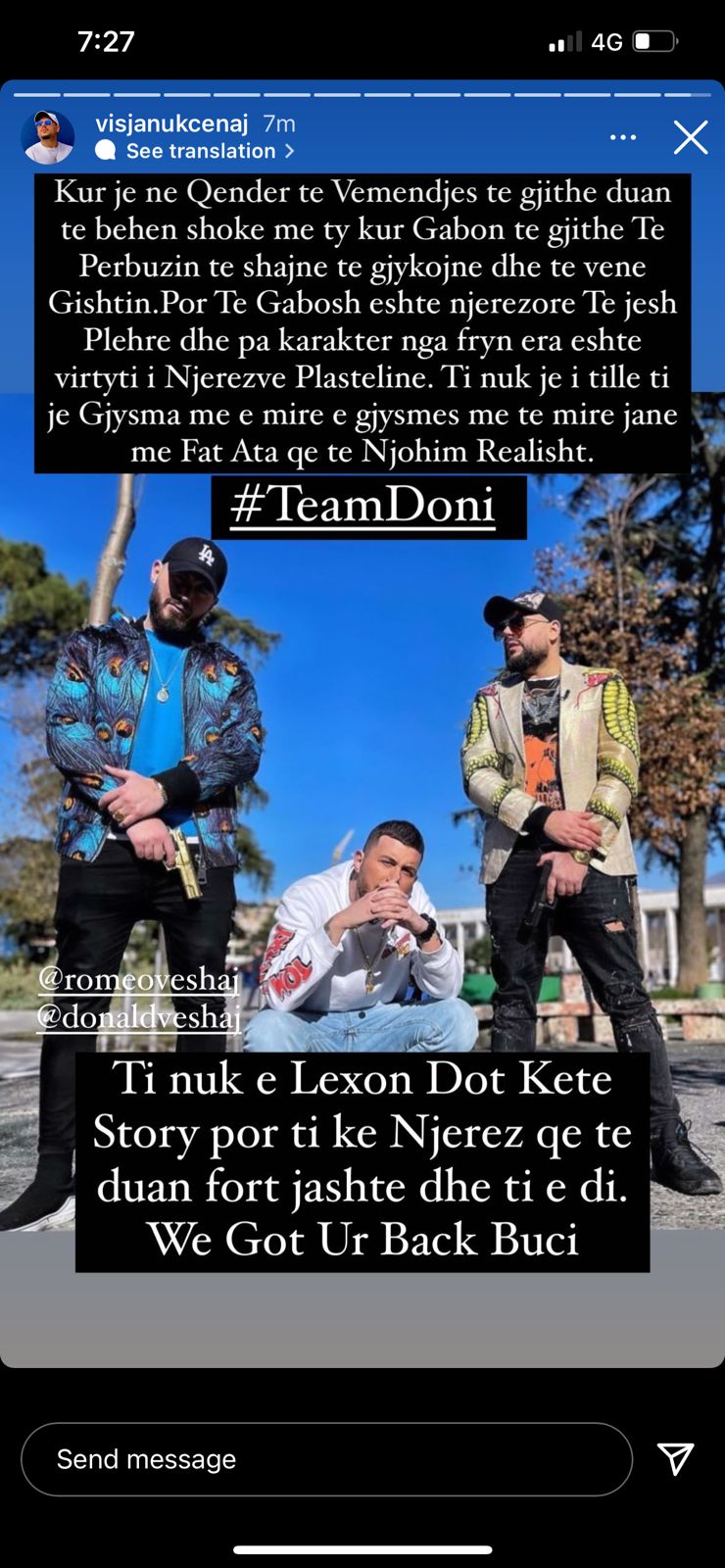 Foto me mesazhin e tij është ndarë në Story edhe nga vëllai i Donaldit, Romeo Veshajt.