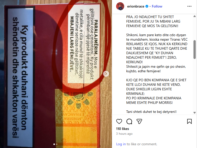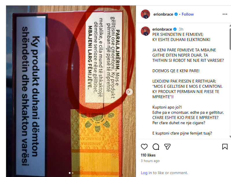 Në një reagim publik me tone të forta, Braçe ngre alarmin për faktin se fëmijët mbajnë duhanin elektronik në duar gjatë gjithë ditës, duke e thithur “si robotë, në një ritual varësie”, ndërkohë që produktet shiten lirshëm edhe për të miturit, pa asnjë pengesë ligjore në praktikë.