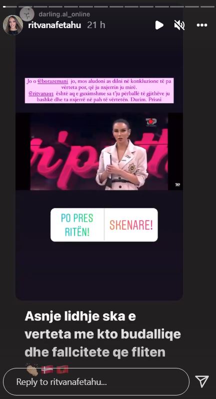 Ndërkohë, Ritvana i ka përgënjeshtruar këto deklarata nëpërmjet një tjetër reagimi në Instagram, ku ka ripostuar bashkëngjitur me një shkrim, videon në të cilën është fragment i fjalës së moderatores.