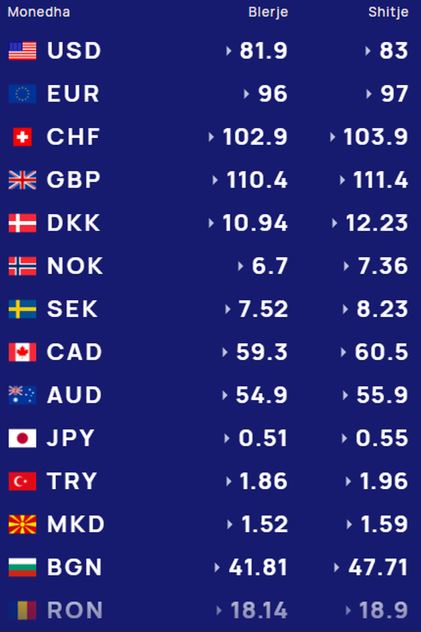 Për kursin e monedhave të tjera shihni tabelën e mëposhtme: