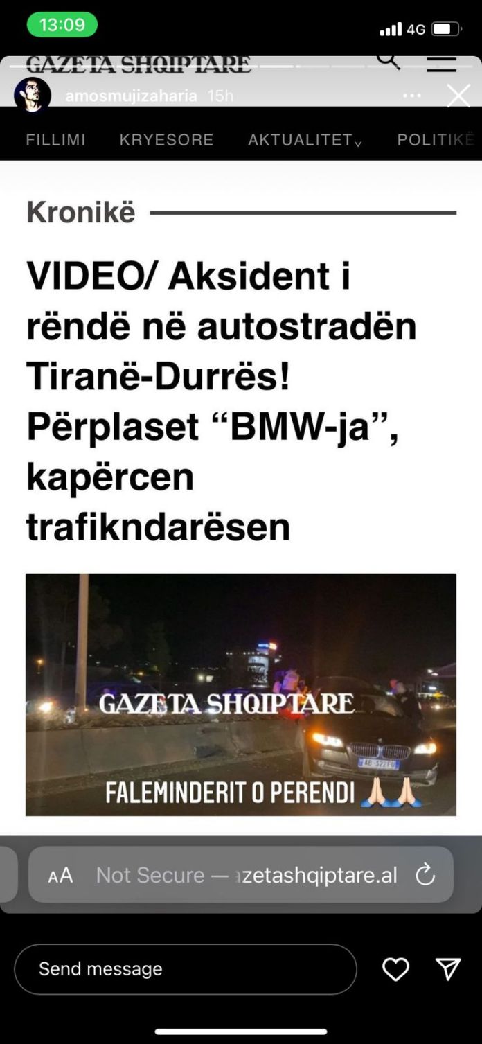 Më tej ai ka publikuar një foto të lajmit të aksidentit të ndodhur, ku sërish ka falendëruar Zotin. “Aksident i rëndë në autostradën Tiranë-Durrës. Përplaset BMW, kalon trafikndarëse”- shkruhej në lajmin në fjalë.