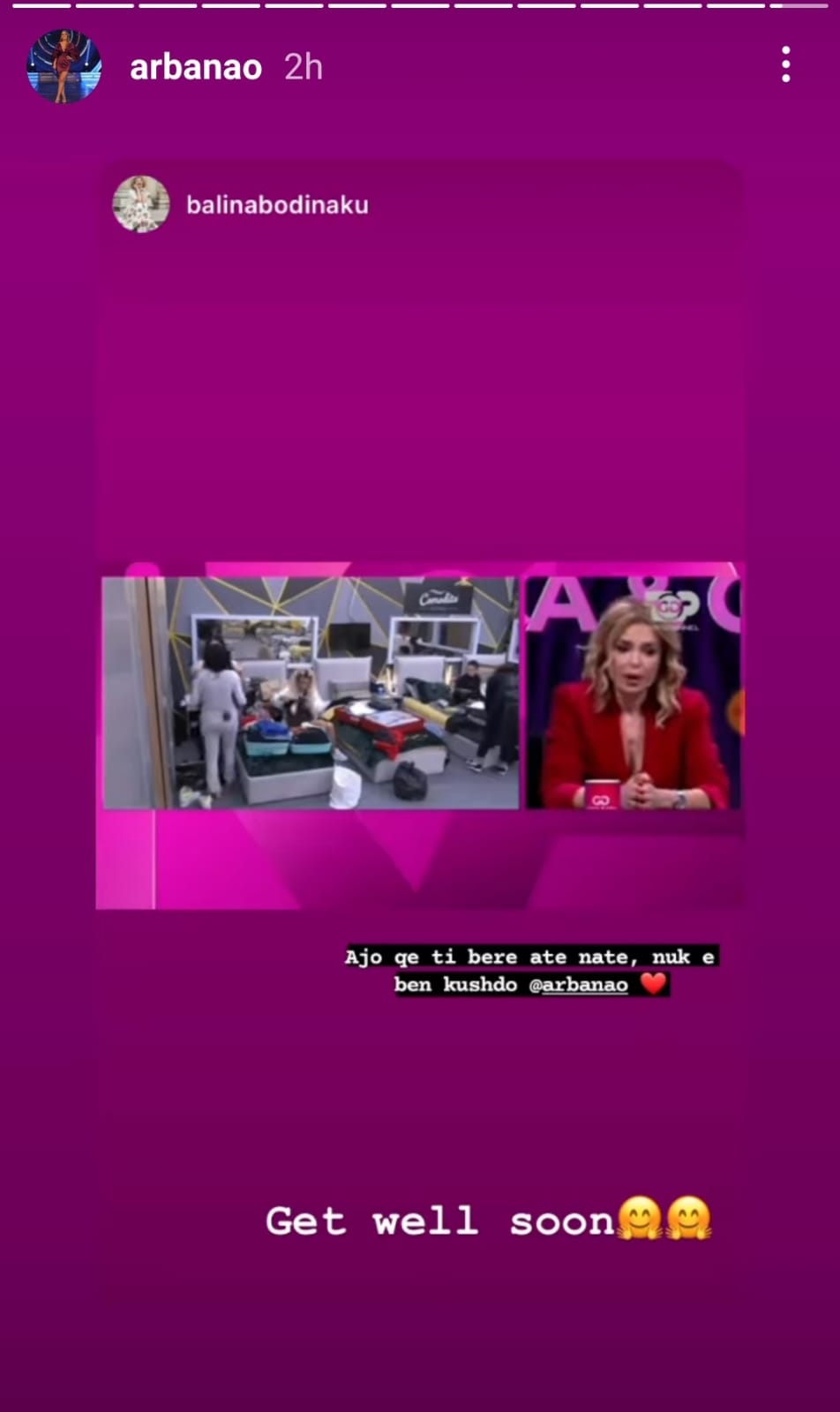 Por, nuk ka shumë rëndësi ajo çfarë tha Balina në një emision ku ishte e ftuar, por ajo çfarë shkruan Arbana në story e saj: Get well soon(Shërohu sa më shpejtë).