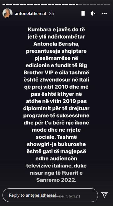 Antonela Berisha, e cila u bë e njohur nga programi i dashurisë Për’puthen dhe më pas mori pjesë në Big Brother VIP do të jetë pjesë e Sanremo 2022.
