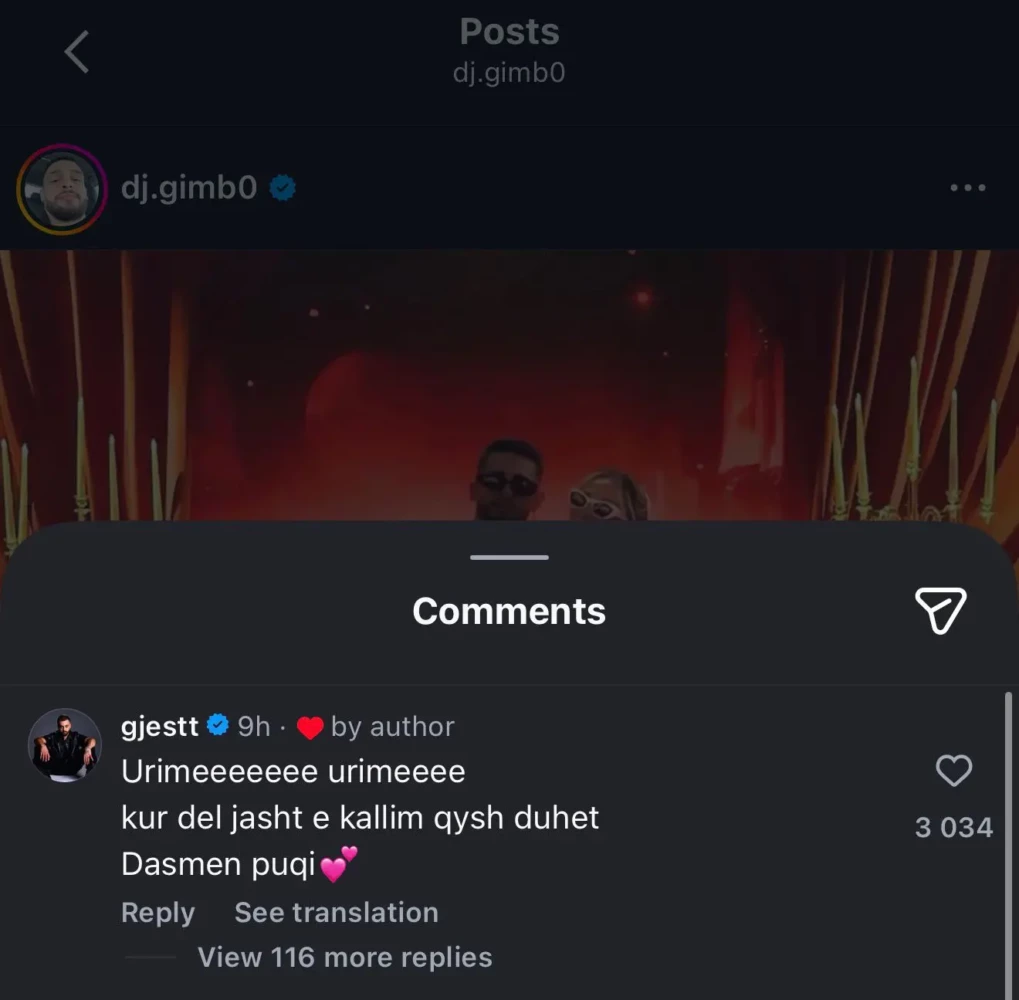 Me një postim në Instagram, ai e uron Gimbon me një mesazh plot humor dhe mbështetje. “Urimeeeeeee urimeeee, kur del jasht e kallim qysh duhet Dasmen puqi,” shkruan ai, duke premtuar një festë të madhe për mikun e tij pas përfundimit të këtij reality show, duke shpresuar për një festë të vërtetë që do të shënojë fillimin e një kapitulli të ri në jetën e tyre.