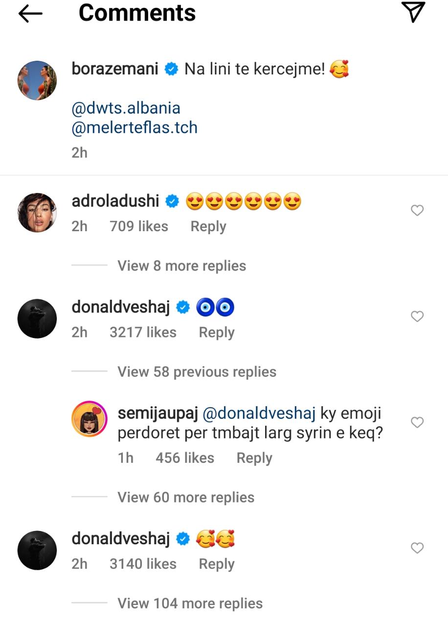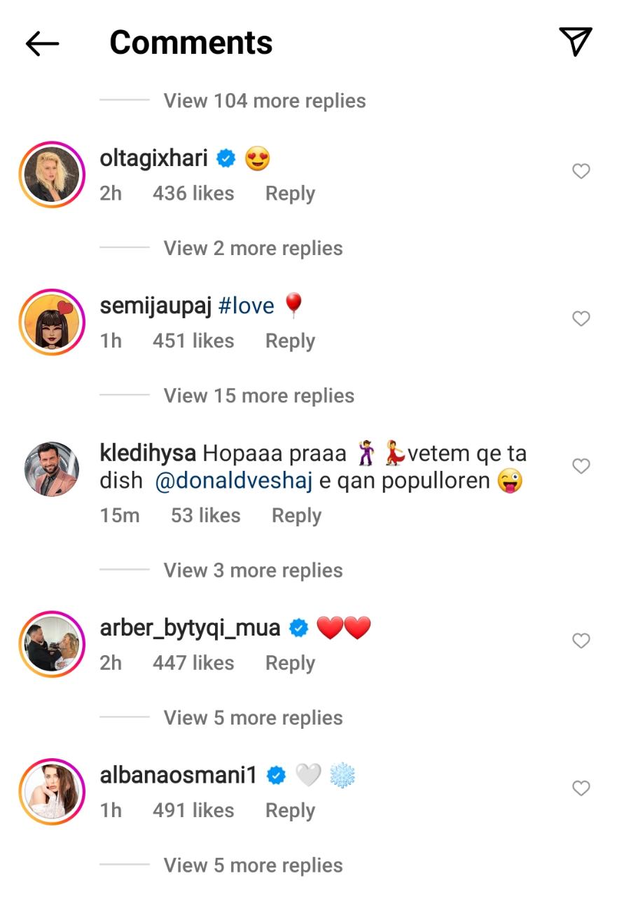 Olta Gixhari ka komentuar me emojin e syve me zemra, Adrola Dushi po ashtu. Ish-konkurrenti i ‘Big Brother VIP”, Kledi Hysa shkruan: “Hopa, pra. Vetëm që ta dish, Donaldi e qan populloren”. Albana Osmani i ka komentuar emojin e një floku dëbore dhe një zemër të bardhë.