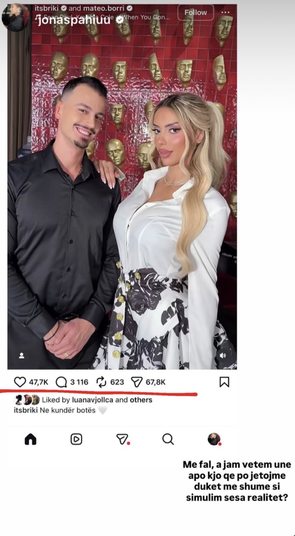 Një postim i fundit në rrjete sociale nga Mateo Borri dhe Brikena Selmanaj, dy ish banoret e Big Brother VIP Albania, ka tërhequr vëmendje jo vetëm për pozën e tyre, por edhe për shifrat e larta të ndërveprimeve.