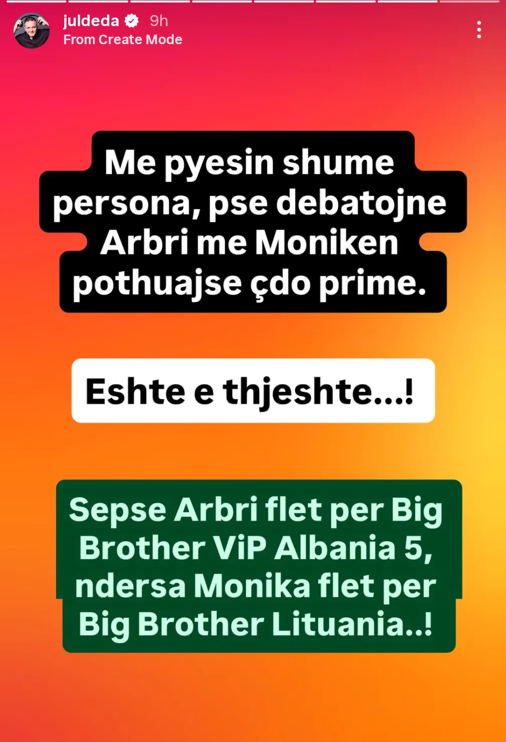 “Sepse Arbri flet për Big Brother VIP Albania 5, ndërsa Monika flet për Big Brother Lituania..!” – ka shkruar aktori në postimin e tij.