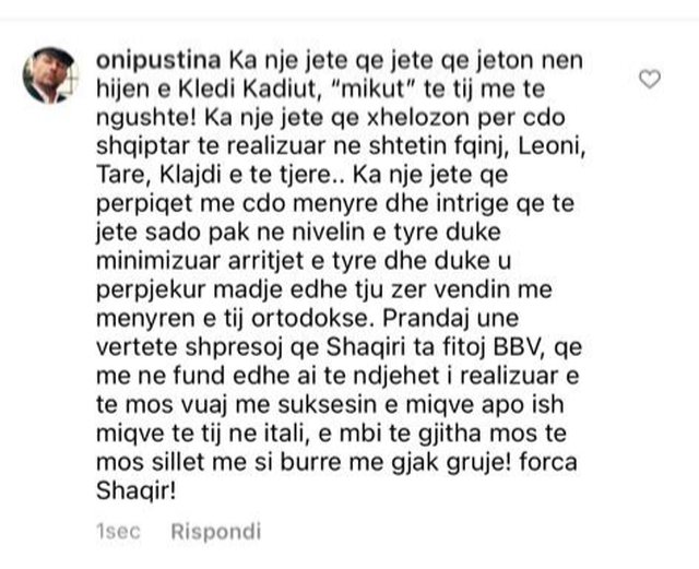 “Ka një jetë që jeton nën hijen e Kledi Kadiut,”mikut” të tij më të ngushte! Ka një jetë që xhelozon per cdo shqiptar të realizuar në shtetin fqinj, Leoni, Tare, Klajsi e të tjerë. Ka një jetë që përpiqet me cdo mënyrë dhe intrigë që të jetë sado pak në nivelin e tyre duke minimizuar arritjet e tyre dhe duke u perpjekur madje edhe t’ju zërë vendin me mënyrën e tij ortodokse. Prandaj unë vertet shpresoj që Shaqiri ta fitoj BBV, që më në fund edhe ai të ndiehet i realizuar e të mos vuajë me suksesin e miqve apo ish miqve te tij në Itali,e mbi të gjitha mos të mos sillet më si burrë me gjak gruaje! Forca Shaqir!”- ka shkruar ai në koment.