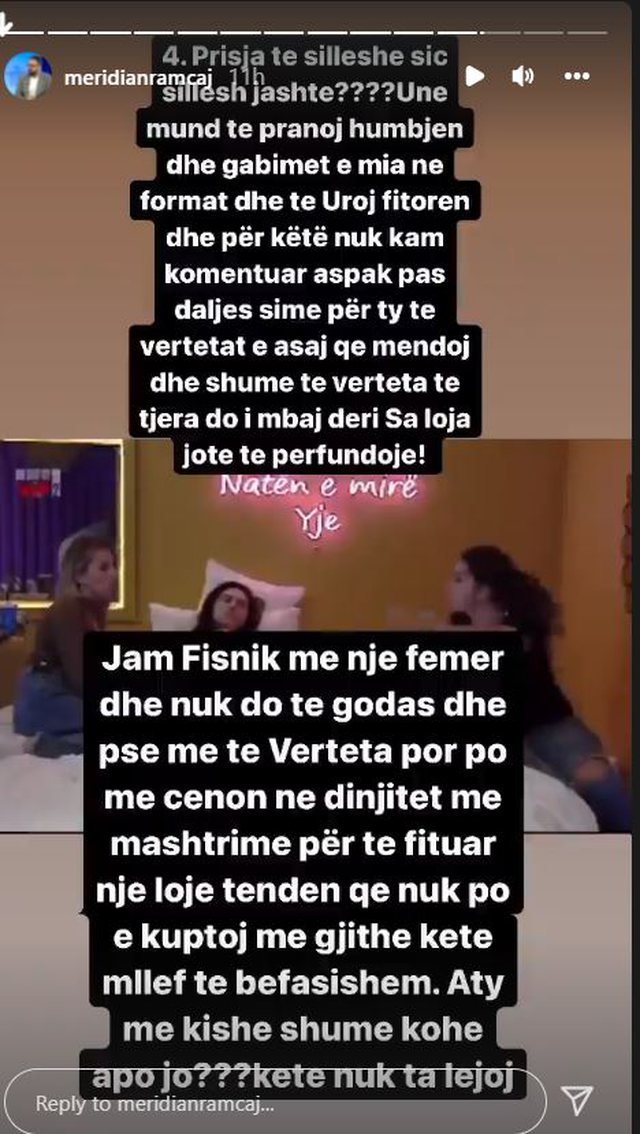 Aktorja ka komentuar deklaratën e tij me banorët ditën e djeshme, ku u shpreh se nuk është distancuar por ka qenë ai që nuk ka treguar afrimitet. Kjo nuk është pritur mirë nga ish banori, i cili ka shpërthyer me disa postime në Instastory.