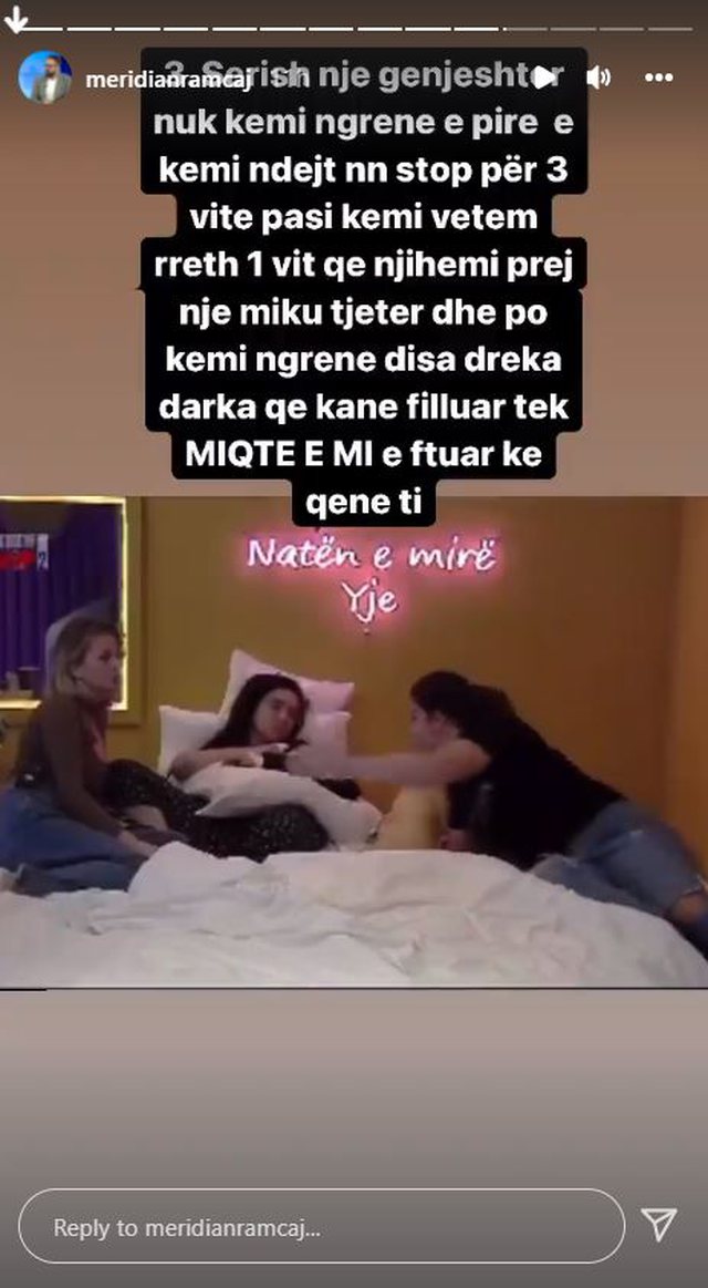 Sërish një gënjeshtër, ne nuk kemi ngrënë e pirë e kemi ndenjur non stop për 3 vite pasi kemi vetëm rreth një vit që njihemi prej një miku tjetër dhe po kemi ngrënë disa dreka, darka që kanë filluar tek miqtë e mi dhe e ftuar ke qenë ti.”, ka shkruar mes të tjerash Meridiani.