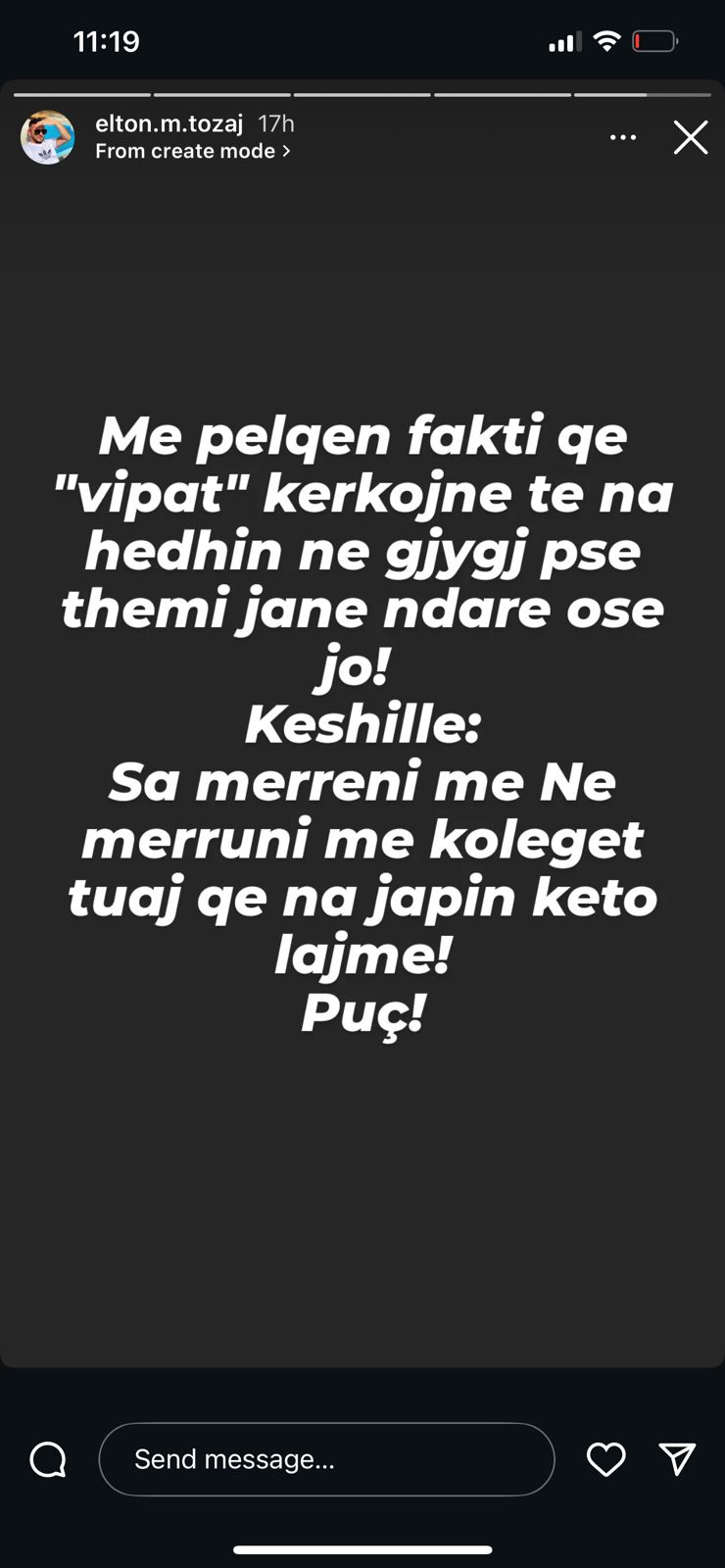 Elton Tozaj ka publikuar një status ku shprehet se është përballur me thirrje në gjykatë pasi ka zbuluar lajmin se një çift showbiz-i po ndahen. Bëhet fjalë për Klean dhe Elgitin, për të cilët prej disa javësh po aludohej se po shkojnë drejt divorcit.