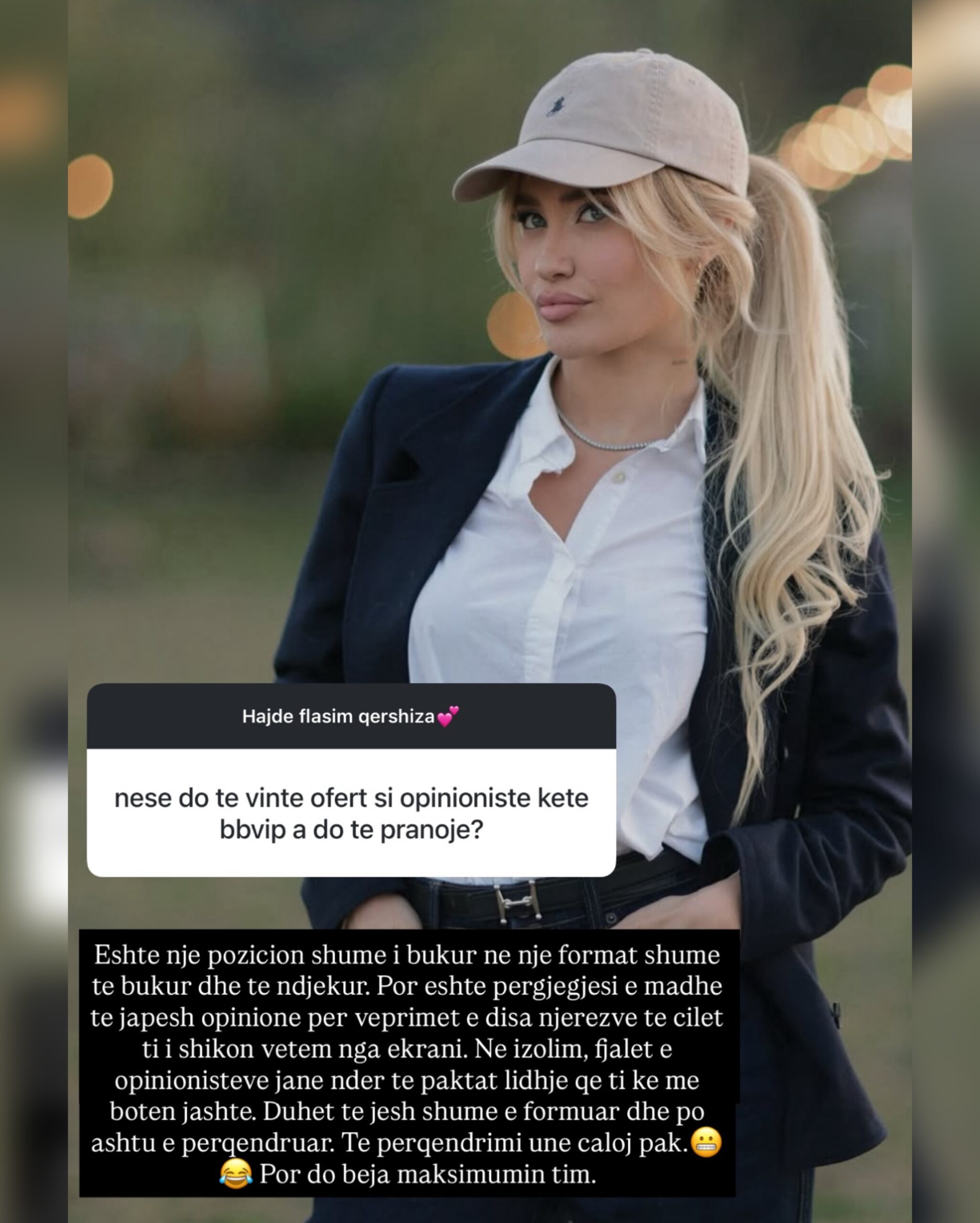 Nga ana tjetër, emri i Dea Mishel doli në pah ditën e djeshme, pasi ajo zhvilloi një ask me ndjekësit e saj në instastory, ku njëri prej tyre e pyeste nëse do ishte opinioniste.