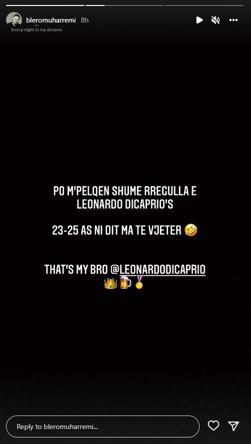 Këngëtari ‘goditi’ me statusin e fundit ku shkruan se i pëlqen rregulli i ri i Leonadro DiCaprios për femrat nën 25-vjeç. “Po më pëlqen shumë rregulli i Leonardo DiCaprios. 23-25, asnjë ditë më të vjetër. Ky është vëllai im”- shkruante Blero, teksa Afrona pak kohë më parë festoi 30 vjetorin e lindjes.