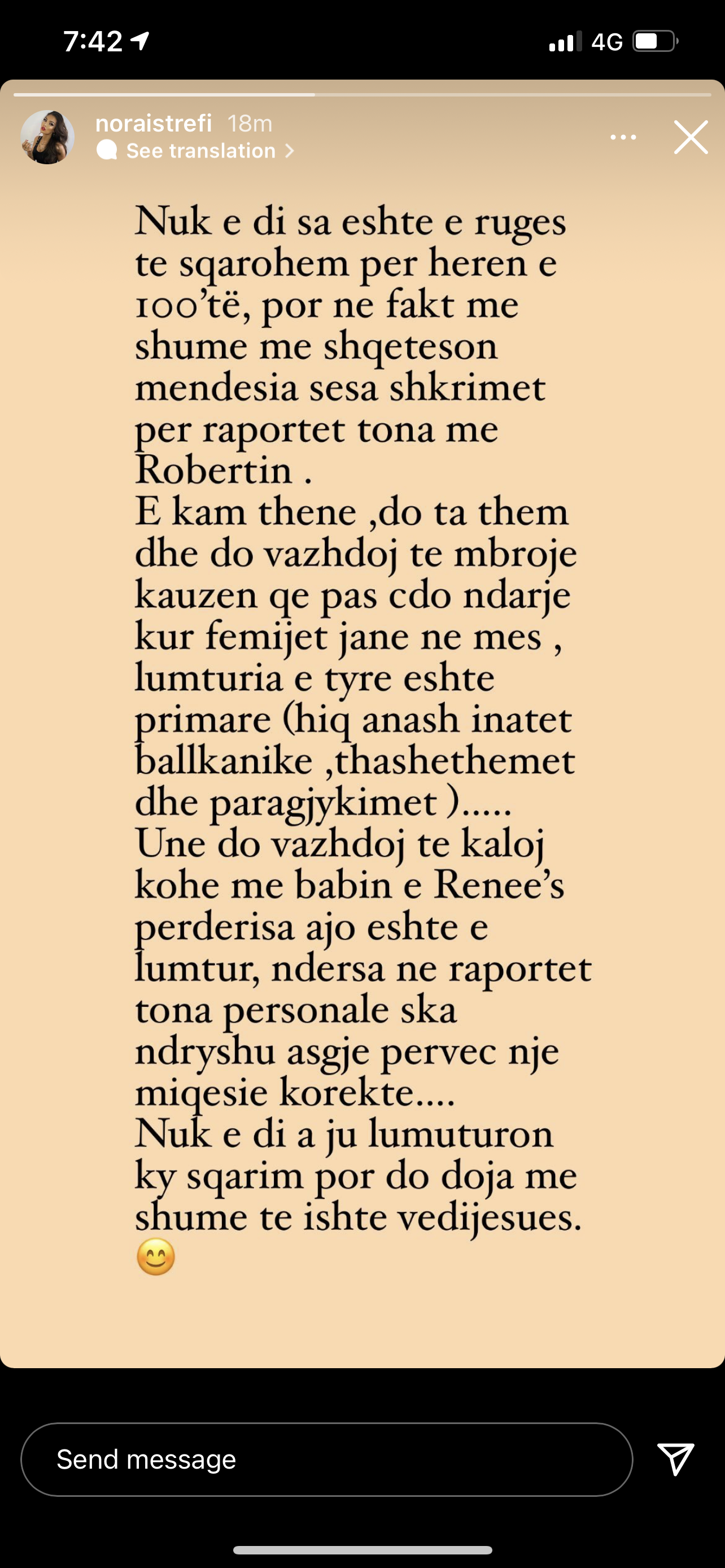 Pushimet e kaluara bashkë, Nora i përkthen në kujdes prindëror për të bijën, duke theksuar se do vazhdojë të kalojë kohë me Robertin, për sa kohë bëhet fjalë për lumturinë e saj!