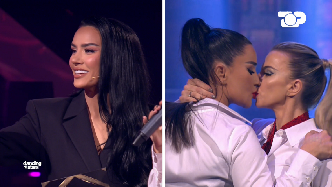 Të veshura njësoj me minifund, këmishë dhe kollare, moderatorja dhe balerina kërcyen një tango argjentinase tejet sensuale. Befasi për publikun ishte mënyra se si vajzat e mbyllën koreografinë, më një puthje në buzë.
