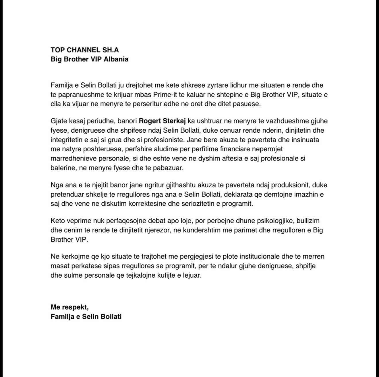 “Familja e Selin Bollati ju drejtohet me këtë shkresë zyrtare lidhur me situatën e rëndë dhe të papranueshme të krijuar mbas Prime-it të kaluar në shtëpinë e Big Brother VIP, situatë e cila ka vijuar në mënyrë të përsëritur edhe në orët dhe ditët pasuese.