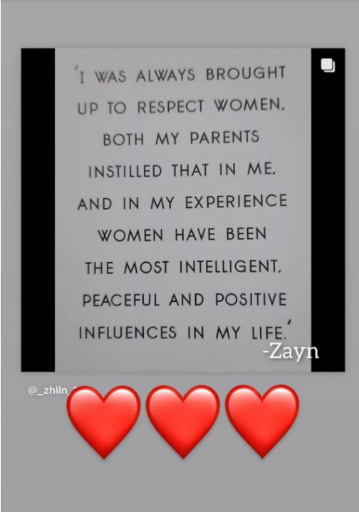 Waliyha Malik ndau një sërë postimesh në Instagram Story të enjten, në mbrojtje të Zayn, pas lajmeve të njëpasnjëshme për akuzën tronditëse të Hadid, si dhe ndarjes së tij nga vajza e Yolanda-s, Gigi Hadid, shkruan “Page Six”.