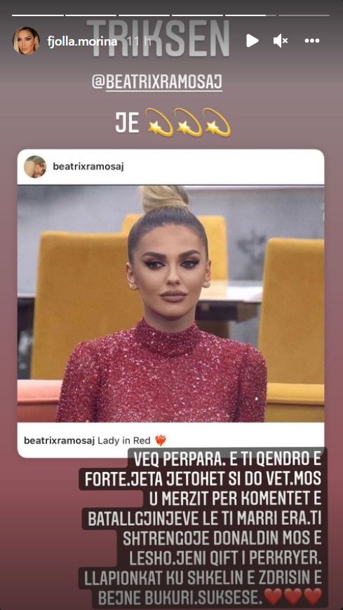 Ajo ka postuar në Instastory foto të saj ku shkruan: “Veç përpara e ti qëndro e fortë, jeta jetohet siç do vetë. Mos u mërzit për komentet e batallgjineve le ti marrë era! Ti shtërngo Donaldin mos e lësho, jeni çift i përkryer. Llapionkat ku shkelin e zhdrisin e bëjnë bukuri. Suksese”.