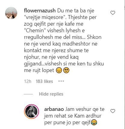“Du me ta ba një ‘vërejtje miqësore’. Thjesht për zog qejfit për një kafe me ‘Chemin’ vishesh, lyhesh e rregullohesh, më del miss… Shkon në një vend kaq madhështor në kontakt me njerëz shumë të njohur, në një vend kaq gjigand… vishesh si me ken tu shku me rujt lopët”, i shkroi ndjekësja.