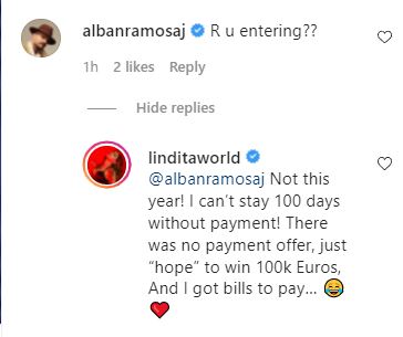 Pyetjes së Alban Ramosaj nëse do jetë pjesë e spektalit, ajo iu përgjigj: “Jo këtë vit! S’mund të qëndroj 100 ditë pa pagesë! Nuk kishte asnjë ofertë pagese, vetëm “shpresën” për të fituar 100.000 euro, dhe unë kam fatura për të paguar …”