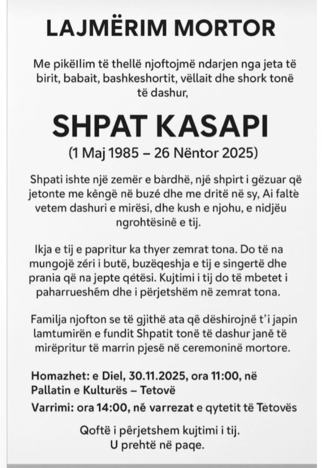 Homazhet do të zhvillohen nesër në orën 11:00 në Pallatin e Kulturës në Tetovë, ndërsa procesioni mortor do të zhvendoset në varrezat e qytetit, ku varrimi i Kasapit është caktuar të mbahet në orën 14:00.