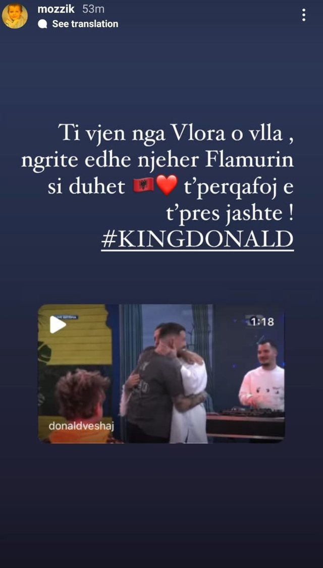 Ditën e sotme, ka shpërndarë videon që është publikuar në llogarinë zyrtare të Donaldit dhe shkruan: “Ti vjen nga Vlora o vlla, ngrite edhe njëherë flamurin si duhet. T’përqafoj e t’pres jashtë! Mbreti Donald”.