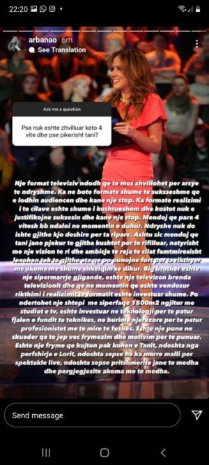 “Nje format televiziv ndodh qe te mos zhvillohet per arsye te ndryshme. Ka ne bote formate shume te suksseshme qe e lodhin audiencen dhe kane nje stop. Ka formate realizimi i te cilave eshte shume i kushtueshem dhe kostot nuk e justifikojne suksesin dhe kane nje stop. Mendoj qe para 4 vitesh bb ndaloi ne momentin e duhur. Ndryshe nuk do ishte gjithe kjo deshire per ta ripare. Ashtu sic mendoj qe tani jane pjekur te gjitha kushtet per te rifilluar, natyrisht me nje vizion te ri dhe ambicje te reja. Big brother eshte nje sipermarrje gjigande, eshte nje televizon brenda televizionit dhe qe ne momentin qe eshte vendosur rikthimi i realizimit te formatit eshte investuar shume. Po ndertohet nje shtepi me siperfaqe 1500m2 ngjitur me studiot e tv, eshte investuar ne teknologji per te patur fjalen e fundit te teknikes, ne burime njerezore per te patur profesionistet me te mire te fushes. Eshte nje pune ne skuader qe te jep vec frymezim dhe motivim per te punuar. Eshte nje fryme qe kujton pak kohen e Tanit, ndoshta nga perfshirja e Lorit, ndoshta sepse na ka marre malli per spektakle live, ndoshta sepse pritshmerite jane te medha dhe pergjegjesite akoma me te medha”, ka thënë Arbana.